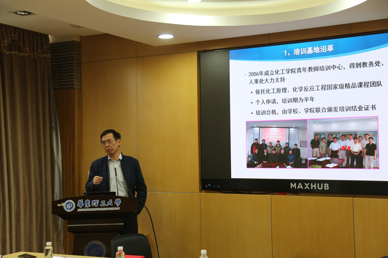 首先,基地负责人许志美介绍了化工类青年教师教学能力培训基地的历史沿革。该基地于2012年成立以来,以437bwin必赢国际官网及资环学院的主要课程团队、实验中心及实习基地为依托,面向两个学院已培养了近60名青年教师。此外,许志美着重介绍了基地培训机制,每位青年教师在带教导师的指导下,逐一完成课程教学、实验教学、实习教学、教学论文以及工程设计能力的培训,旨在培养青年教师的教学素养和教学基本功。
