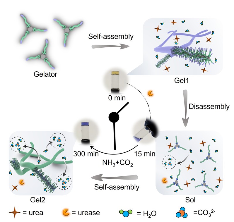 必赢官网研究人员提出将酶促反应与Hofmeister效应相耦合的思想,成功构筑出能够动态感知Hofmeister离子序列的智能超分子水凝胶,模拟生命体对微环境变化的自适应感知行为。团队设计的凝胶因子含有羧酸基团,其自组装行为可被尿素水解生成的亲液离子NH₄⁺、CO₃²⁻(Kosmotropic ions)精确调控。在脲酶催化下,尿素水解产生的碱性NH₃和亲液离子诱导凝胶经历从Gel1到溶胶Sol再到Gel2的自主转变,实现对离子信号的实时感知与力学状态的动态演变,将化学信号有效转化为宏观物性变化,为多模态输出和智能反馈奠定了基础。