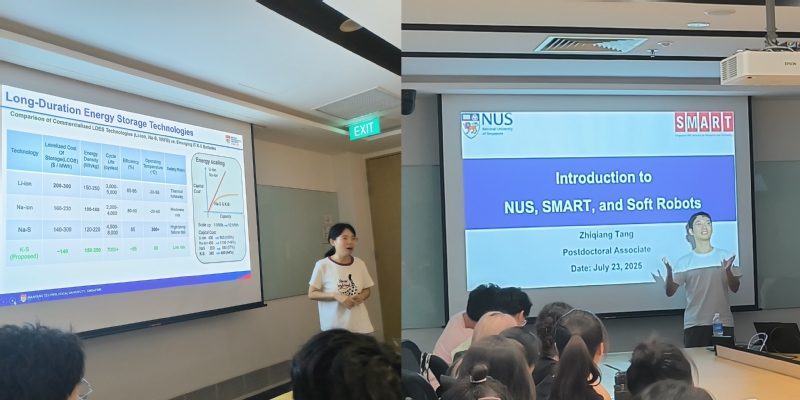在南洋理工大学材料科学与工程学院,校友田丽颖博士介绍了其团队在碱金属电池安全材料设计方面的最新研究进展。新加坡-MIT联合研究中心的唐志强博士以“新型软体机器人的研究与发展”为题,介绍了其团队受章鱼、象鼻等自然结构启发,构建软体机器原型,在中风康复等医疗场景中的应用案例。